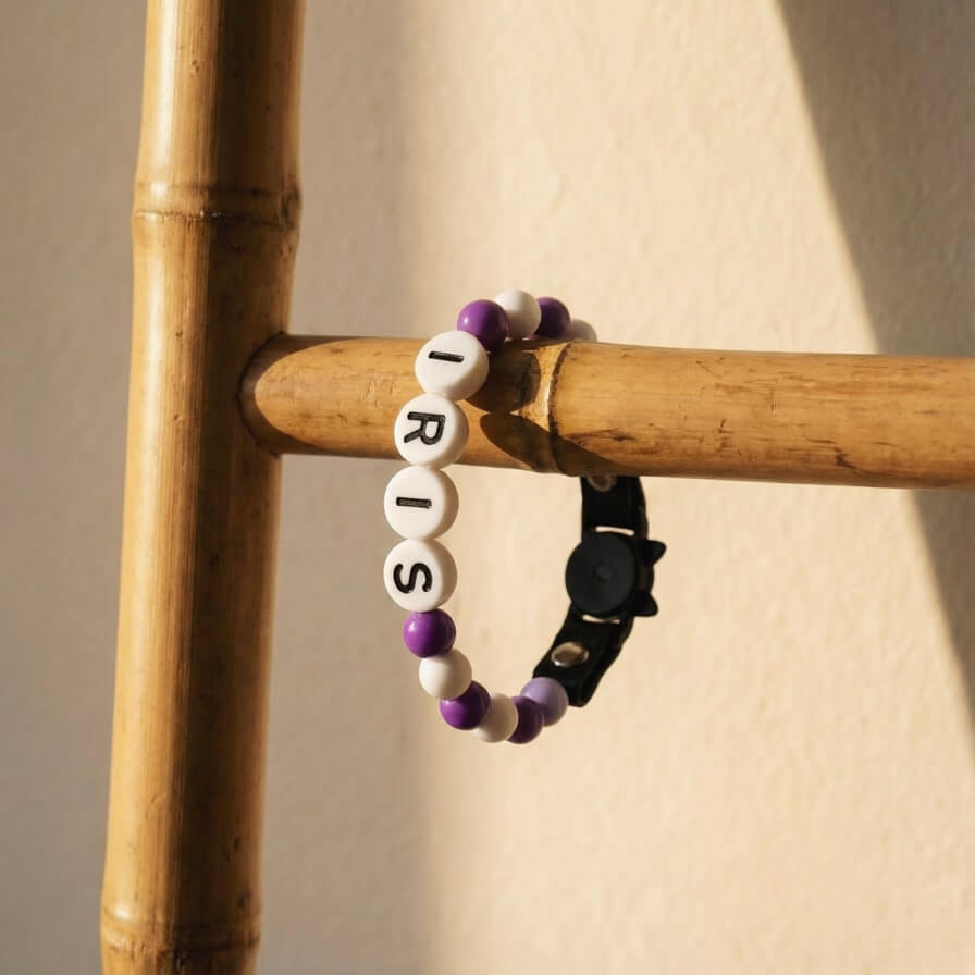 Perles légères, lettres PLA+ 3D, câble inox waterproof, Biothane® résistant, boucle sécurisée & anneau D métal.