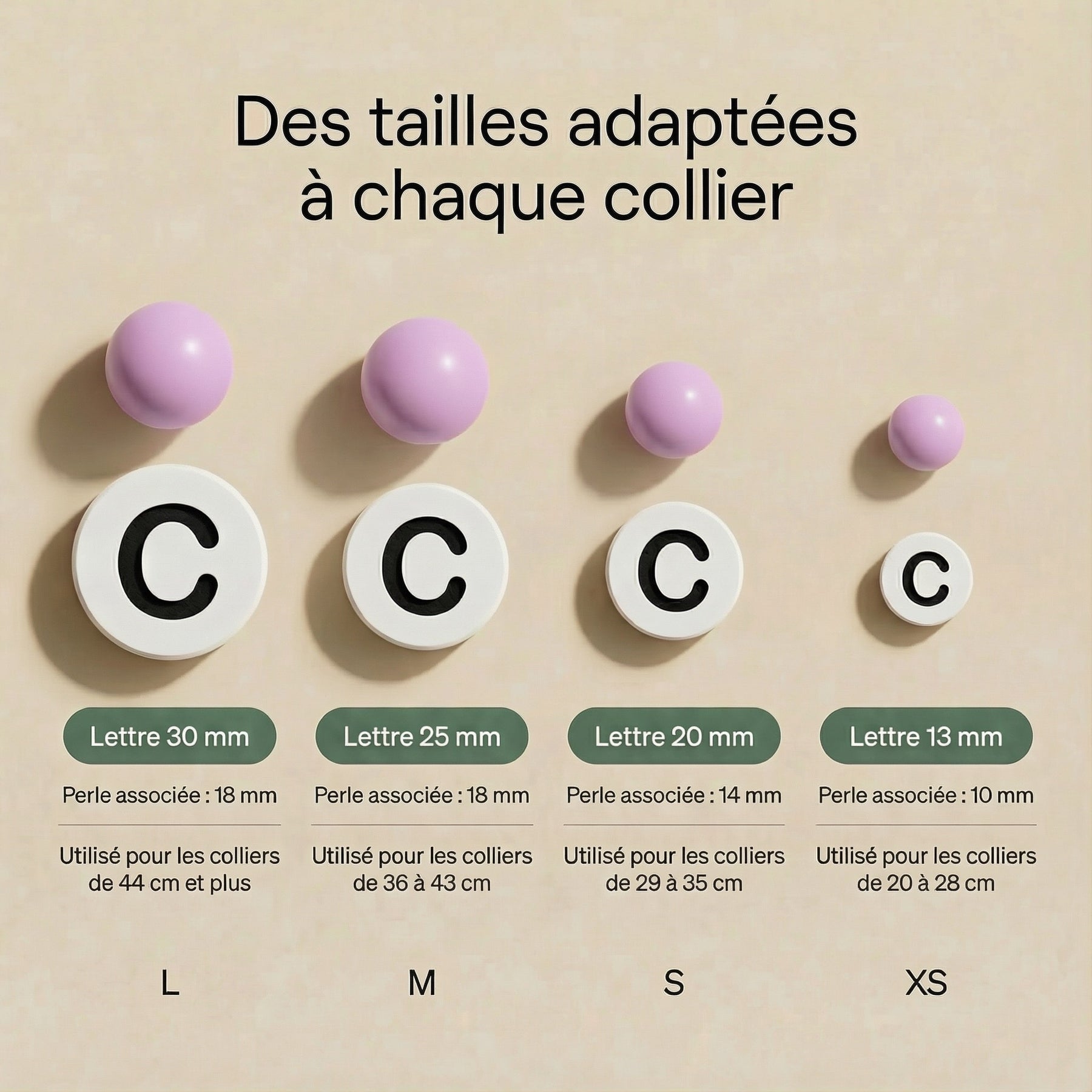 Perles légères, lettres PLA+ 3D, câble inox waterproof, Biothane® résistant, boucle sécurisée & anneau D métal.