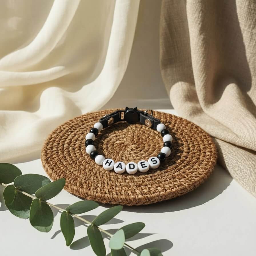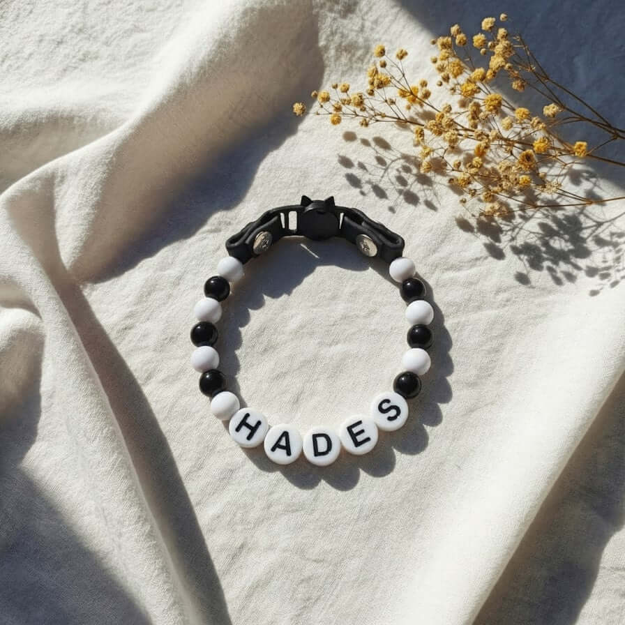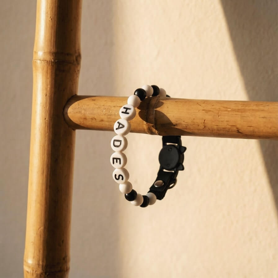 Perles légères, lettres PLA+ 3D, câble inox waterproof, Biothane® résistant, boucle sécurisée & anneau D métal.