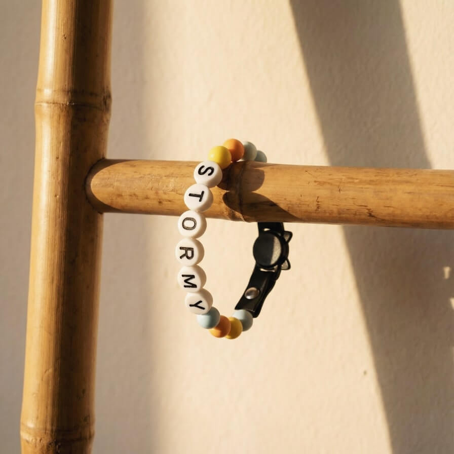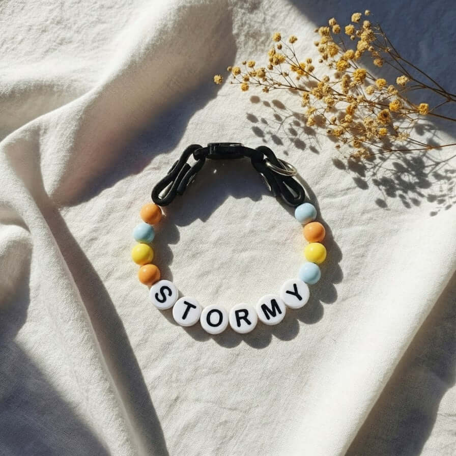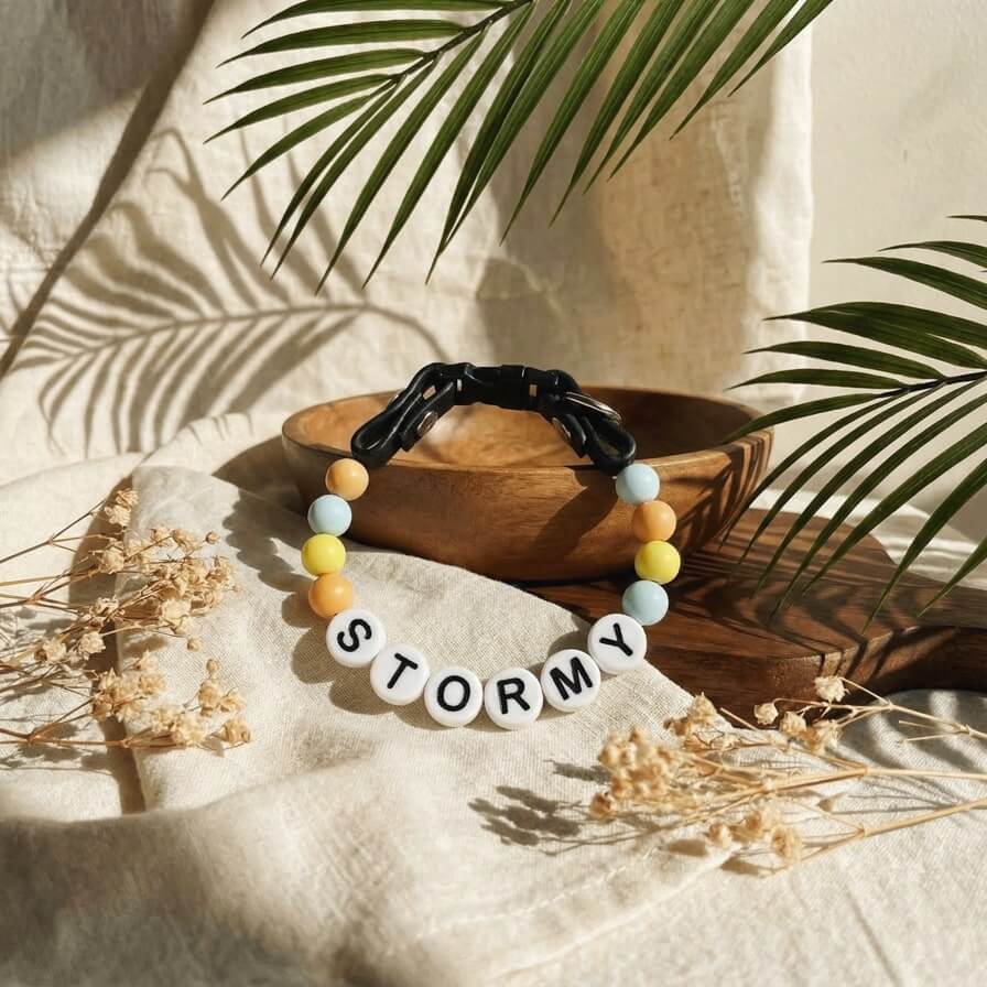 Perles légères, lettres PLA+ 3D, câble inox waterproof, Biothane® résistant, boucle sécurisée & anneau D métal.